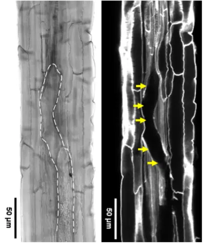 We have found that plants have evolved a powerful signalling mechanism to detect defects in the endodermis barrier and can induce over-lignification, which is also associated with increased resistance to a variety of soil-borne pathogens. Our findings show that Arabidopsis roots deposit localized ectopic lignification in response to cyst nematode damage (Figure 3).