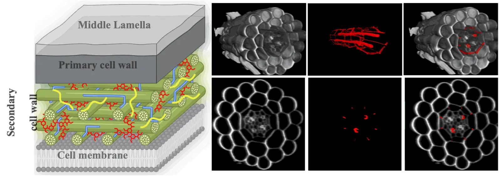Figure 2: Plants' secondary cell wall contains lignin, pectin, cellulose and hemicellulose shown in red, yellow, green and blue respectively (right). Left: Orthogonal structure of Arabidopsis root, stained with basic fuchsin (red) for lignin and calcofluor white (grey) for cell wall visibility.