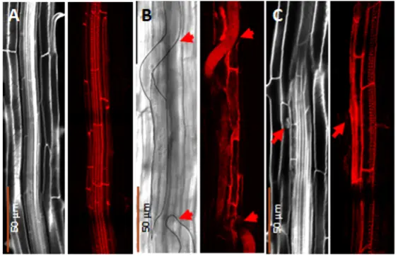 Figure 3: Localized lignin and suberin deposition in Arabidopsis root. A-C: 5-day old roots stained with basic fuchsin (red color) to visualize lignin. A: Control root. B: Nematodes damaging roots cells during migration phase. An outline has been drawn around nematode body to visualize nematodes. C: A single cortex cell damaged using laser ablation. The red color in figures A-C represents lignin stained with basic fuchsin.